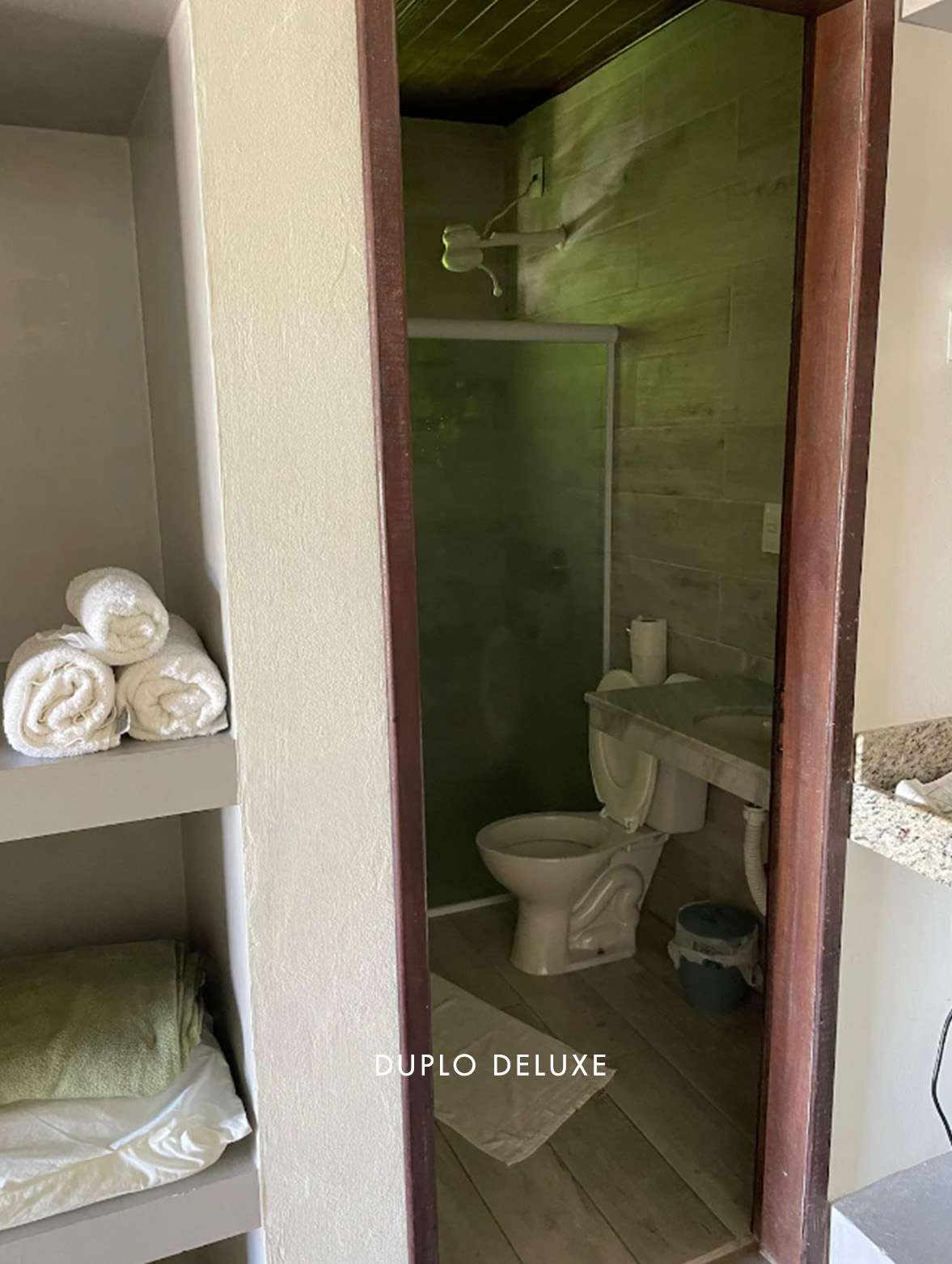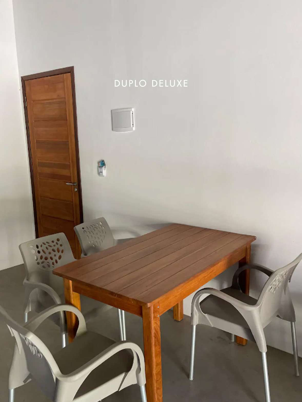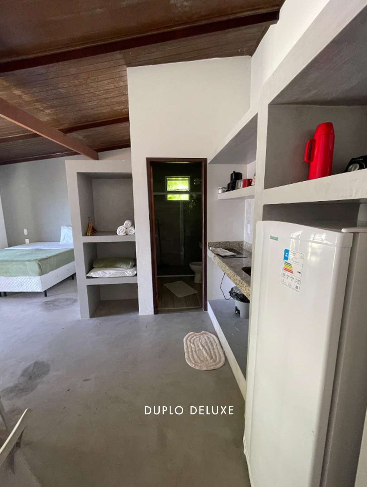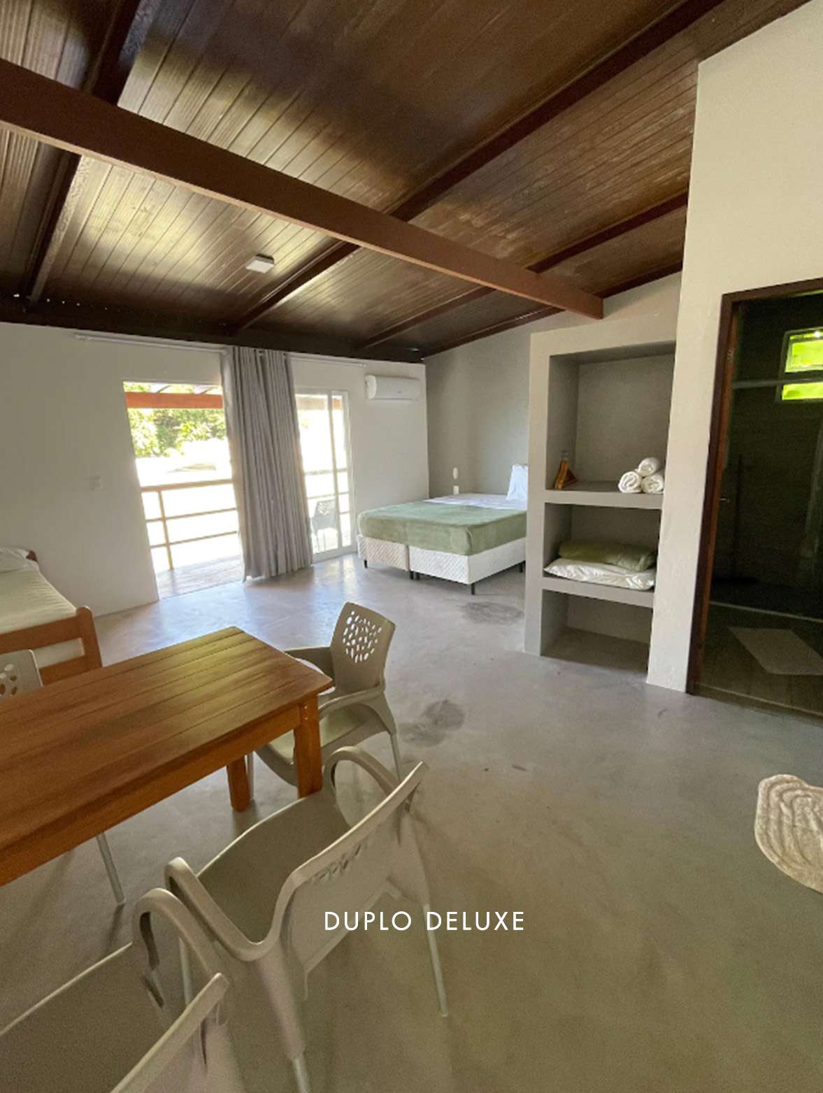 O apartamento conta também com banheiro privativo espaçoso e moderno, além de uma varanda com vista deslumbrante para o mar, onde é possível relaxar e apreciar a paisagem. Há ainda uma cozinha compacta equipada com geladeira, pia e itens básicos, além de uma mesa de jantar para reunir todos em um só lugar.