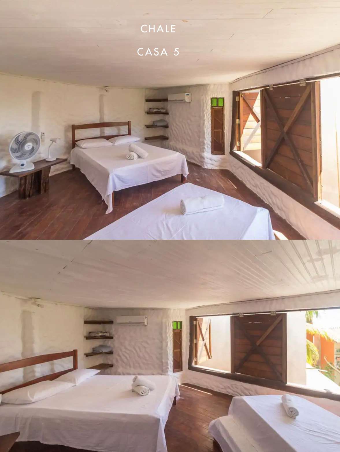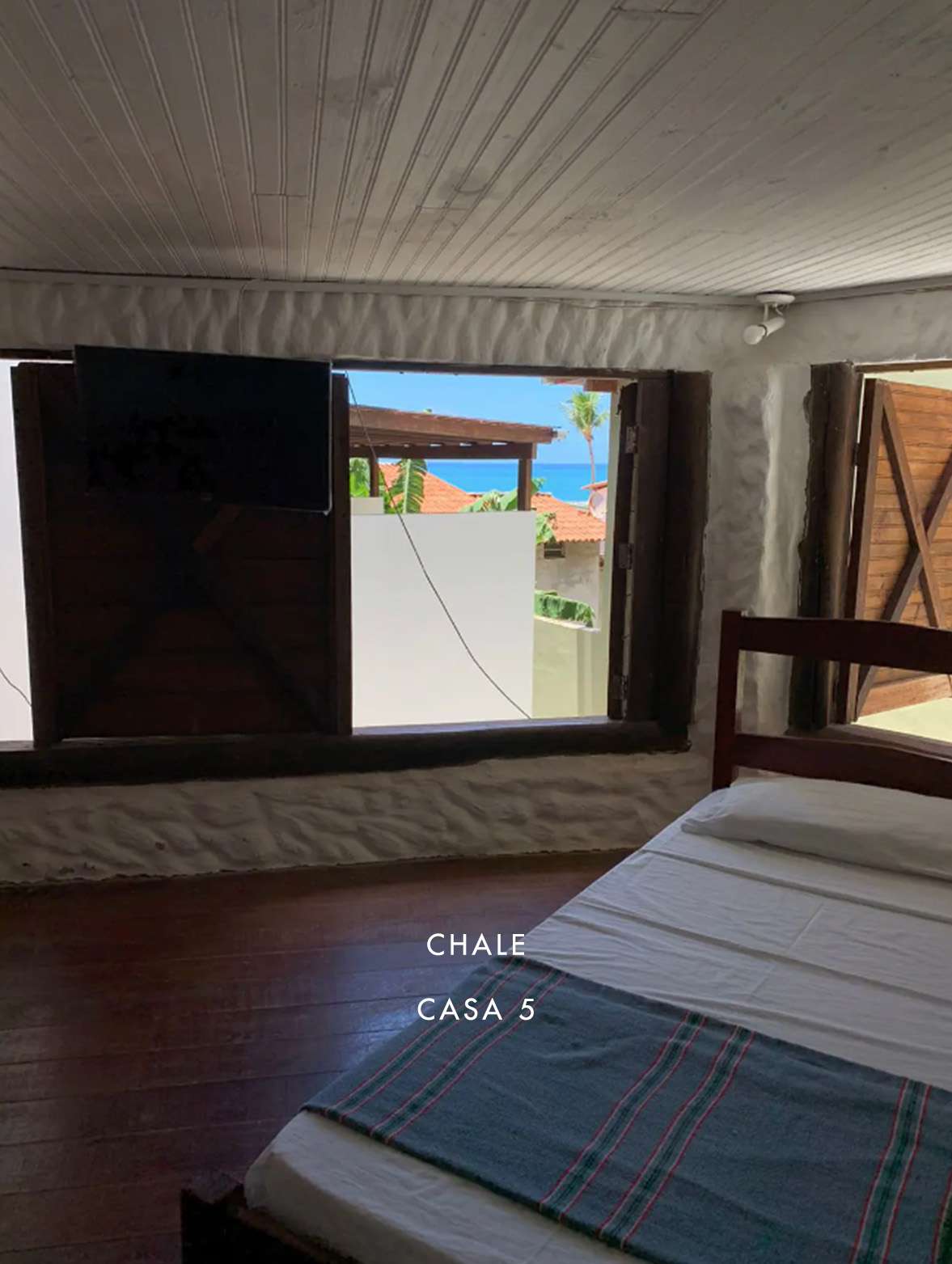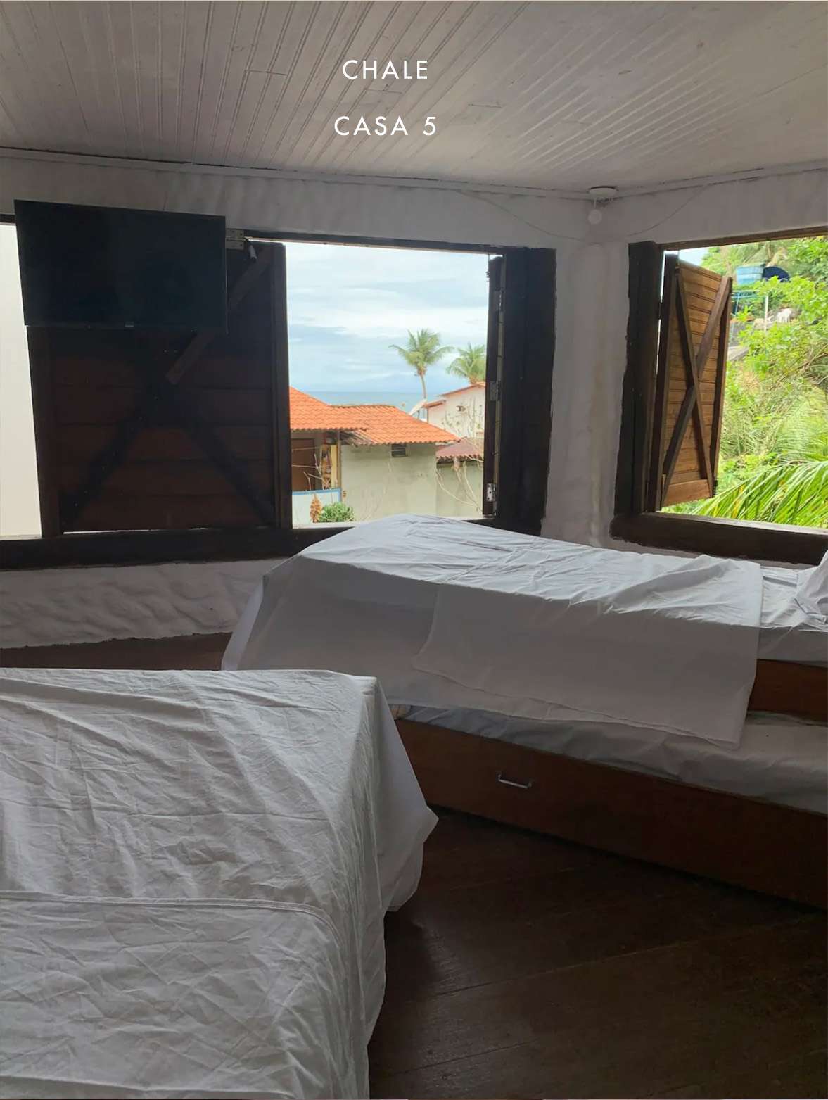O espaço conta com ventilador e ar-condicionado, além de amplas janelas de madeira que permitem a entrada de luz natural e a brisa do mar, trazendo frescor e uma atmosfera charmosa ao ambiente. O chalé também dispõe de banheiro privativo, TV e uma área com mesa e cadeiras, além de itens básicos para refeições, garantindo praticidade durante a estadia.